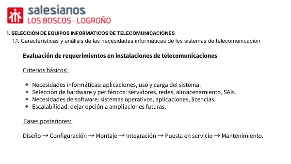Evaluación de requerimientos en instalaciones de telecomunicaciones Criterios básicos: 🔹 Necesidades informáticas: aplicaciones, uso y carga del sistema. 🔹 Selección de hardware y periféricos: servidores, redes, almacenamiento, SAIs. 🔹 Necesidades de software: sistemas operativos, aplicaciones, licencias. 🔹 Escalabilidad: dejar opción a ampliaciones futuras. Fases posteriores: Diseño → Configuración → Montaje → Integración → Puesta en servicio → Mantenimiento.