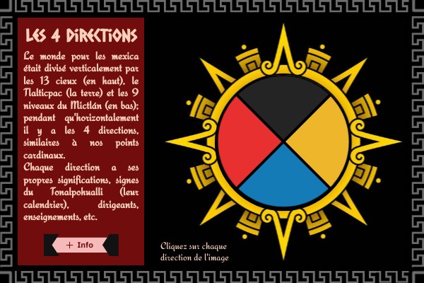 Les directions variaient pour chaque culture, époque et selon les sources historiques. Dans cette infographie, comme on l'a déjà dit, on parlera des directions selon la vision du monde mexica, ou ce qu'on sait d'elle. Mais on peut toujours tomber sur des contradictions et indéterminations, car après La Conquête, la plupart des informations qui ont survécu sont passées par les mains des Espagnols. Ceci s'applique presque à tout ce qu'on sait des peuples préhispaniques.