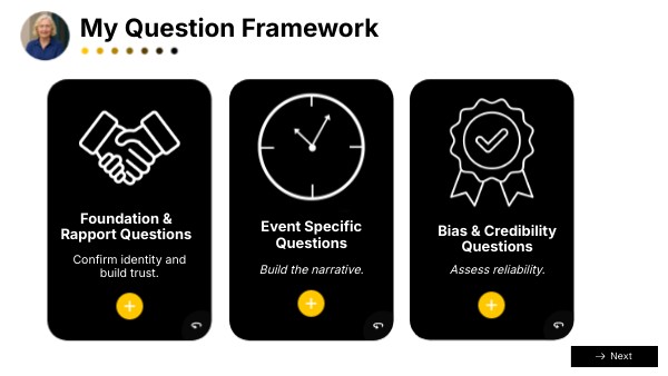 Transcript:Treat the incident like a movie. Get all the details so you can visualize every aspect of it from the witness’s perspective: what they saw, heard, felt, smelled, as well as their experience of the whole incident before, during, and after. It is essential that you are able to sequence the events according to the witness by the time you’re done.