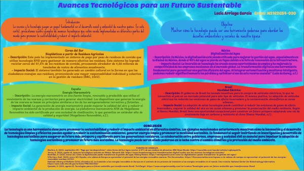 FUENTES DE CONSULTA Martins, A. (2024, septiembre 29). "Paga por tus desperdicios": cómo Corea del Sur logra reciclar el 97% de sus residuos de alimentos. BBC News Mundo. https://www.bbc.com/mundo/articles/cq8xzxpek7lo Torres, A. (2025, agosto 8). Avances tecnológicos actuales en México. Network 360. https://www.itmastersmag.com/transformacion-digital/cuales-son-los-avances-tecnologicos-actuales/ Santillán, A. (2025, marzo 20). Cómo la digitalización puede transformar la gestión del agua. Mining México. https://miningmexico.com/como-la-digitalizacion-puede-transformar-la-gestion-del-agua/ Villa Caro, Raúl. (2025, enero 30). España, a la cabeza de Europa en aprovechar el potencial de las energías renovables marinas. The Conversation. https://theconversation.com/espana-a-la-cabeza-de-europa-en-aprovechar-el-potencial-de-las-energias-renovables-marinas-247941 National Library of Medicine (2024, diciembre 6). La transición a las energías renovables en Europa en el contexto de los procesos de transición a las energías renovables en el mundo. Una revisión. National Center for Biotechnology Information. https://pmc.ncbi.nlm.nih.gov/articles/PMC11667622/ Quezada, V. (2023, agosto 8). Tecnologías para un futuro sostenible que transformarán Brasil. TechTarget. https://www.computerweekly.com/es/cronica/Tecnologias-para-un-futuro-sostenible-que-transformaran-Brasil