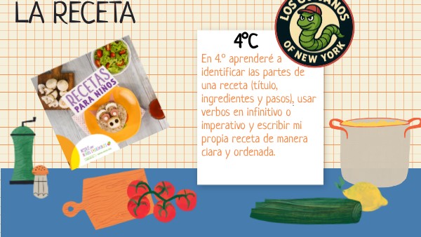 En 4.º aprenderé a identificar las partes de una receta (título, ingredientes y pasos), usar verbos en infinitivo o imperativo y escribir mi propia receta de manera clara y ordenada.
