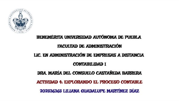 BENEMÉRITA UNIVERSIDAD AUTÓNOMA DE PUEBLA FACULTAD DE ADMINISTRACIÓN LIC. EN ADMINISTRACIÓN DE EMPRESAS A DISTANCIA CONTABILIDAD I DRA. MARÍA DEL CONSUELO CASTAÑEDA BARRERA ACTIVIDAD 4: EXPLORANDO EL PROCESO CONTABLE 202536365 LILIANA GUADALUPE MARTÍNEZ DÍAZ