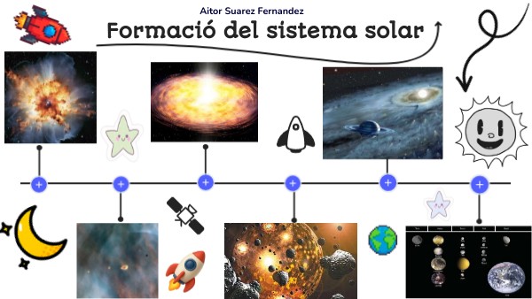 "A mesura que el Sol acabava de consolidar-se, la pols i el gas que l’envoltaven van començar a ajuntar-se. La gravetat i les contínues col·lisions entre petites partícules van fer que es formessin blocs cada vegada més grans. D’aquesta manera, van aparèixer els primers asteroides i petits planetes, tots ells disposats en un gran disc al voltant de l’estrella recent nascuda.