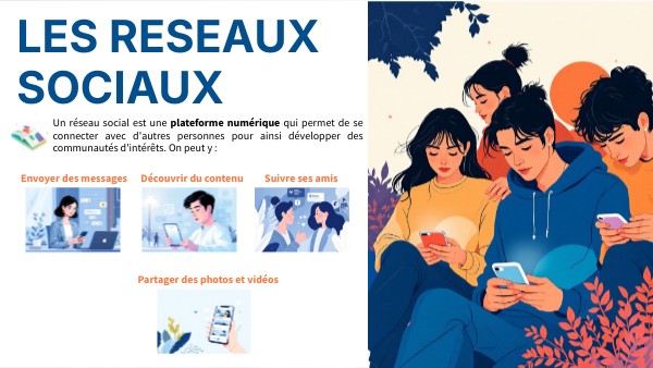 Un réseau social est une plateforme numérique qui permet de se connecter avec d'autres personnes pour ainsi développer des communautés d'intérêts. On peut y :