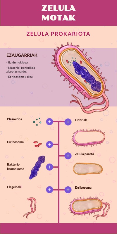 - Ez du nukleoa. - Material genetikoa zitoplasma du. - Erribosomak ditu.