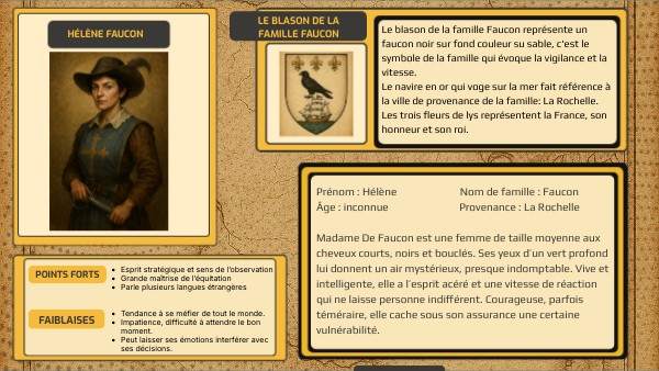 Prénom : Hélène Nom de famille : FauconÂge : inconnue Provenance : La Rochelle Madame De Faucon est une femme de taille moyenne aux cheveux courts, noirs et bouclés. Ses yeux d’un vert profond lui donnent un air mystérieux, presque indomptable. Vive et intelligente, elle a l’esprit acéré et une vitesse de réaction qui ne laisse personne indifférent. Courageuse, parfois téméraire, elle cache sous son assurance une certaine vulnérabilité.