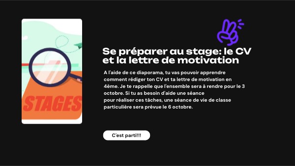 A l'aide de ce diaporama, tu vas pouvoir apprendre comment rédiger ton CV et ta lettre de motivation en 4ème. Je te rappelle que l'ensemble sera à rendre pour le 3 octobre. Si tu as besoin d'aide une séance pour réaliser ces tâches, une séance de vie de classe particulière sera prévue le 6 octobre.