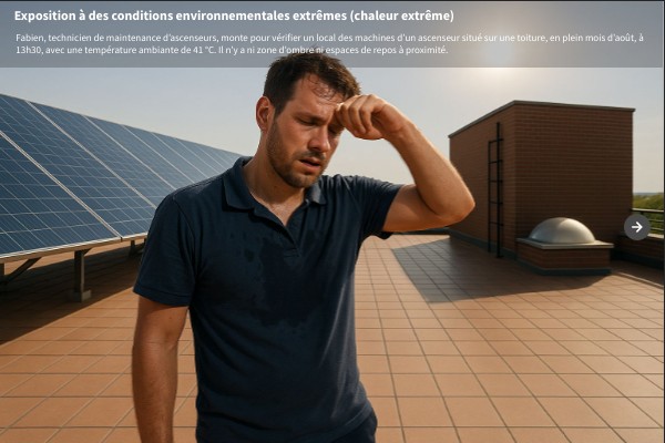 Fabien, technicien de maintenance d’ascenseurs, monte pour vérifier un local des machines d’un ascenseur situé sur une toiture, en plein mois d’août, à 13h30, avec une température ambiante de 41 °C. Il n’y a ni zone d’ombre ni espaces de repos à proximité.