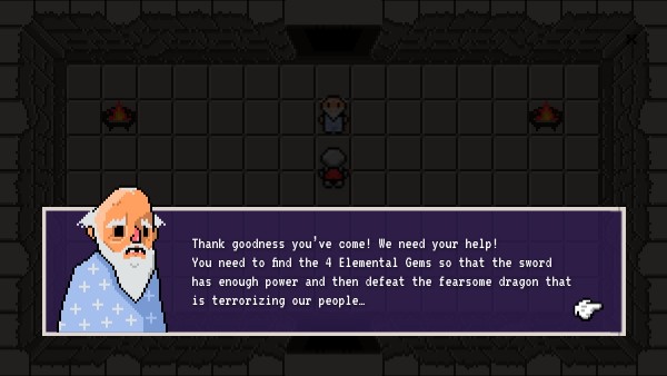 Thank goodness you’ve come! We need your help! You need to find the 4 Elemental Gems so that the sword has enough power and then defeat the fearsome dragon that is terrorizing our people…