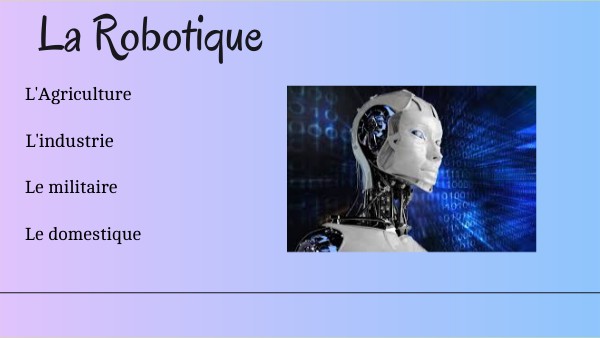 La robotique dans l'agriculture est en plein essor. De plus en plus de robots agricoles sont développés et construits. Il existe différents styles de robots agricoles : robots désherbeurs, robots qui récoltent les céréales ou qui les plantent, robot de traite des vaches. Impact social, dans nos vies : Les productions sont plus rapides et moins chères au long terme. Malheureusement, de nombreux employés se retrouvent au chomage car le besoin de main d'oeuvre diminue. Impact environnemental : De nombreux autres robots agricoles existent également. Par exemple, en 2019, un robot désherbeur n'utilisant pas de produits chimiques a été conçu par la Maïo Technologie. C'est un très bon point pour la robotique. Cela pousse de nombreux pays comme la France et la Finlande à construire des robots pour l'environnement. Agriculture de demain : Grâce aux nombreuses technologies inventées ces derniers temps, il est probable qu'un jour toute l'agriculture soit dominée par la robotique. il se pourrait aussi que l'agriculture deviennent totalement autonome.