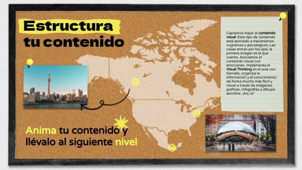 Captamos mejor el contenido visual. Este tipo de contenido está asociado a mecanismos cognitivos y psicológicos. Las cosas entran por los ojos, la primera imagen es la que cuenta. Asociamos el contenido visual con emociones. Implementa el Visual Thinking en el aula con Genially: organiza la información y el conocimiento de forma mucho más fácil y visual a través de imágenes, gráficas, infografías y dibujos sencillos. ¡Así, sí!