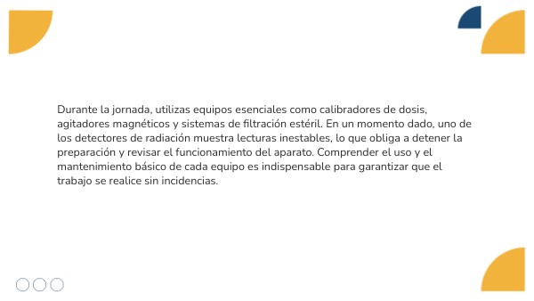 Durante la jornada, utilizas equipos esenciales como calibradores de dosis, agitadores magnéticos y sistemas de filtración estéril. En un momento dado, uno de los detectores de radiación muestra lecturas inestables, lo que obliga a detener la preparación y revisar el funcionamiento del aparato. Comprender el uso y el mantenimiento básico de cada equipo es indispensable para garantizar que el trabajo se realice sin incidencias.