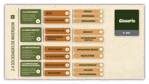 1.Capital variable (sociedades): Una Sociedad de Capital Variable (S.A. de C.V.) es una forma jurídica de empresa que se caracteriza por la flexibilidad en su capital social, el cual puede incrementarse o disminuirse sin necesidad de reformar los estatutos de la empresa (Financionario, s.f., párr. 1).2. perdida neta: Una pérdida neta es cuando los gastos totales (incluidos impuestos, tarifas, intereses y depreciación) superan los ingresos o ingresos producidos durante un período de tiempo determinado (Inverstor's wiki, s.f., párr. 1) 3.valores de renta variable: Los Valores de Renta Variable son aquellos que no ofrecen un rendimiento periódico, ya que su rentabilidad dependerá en buena parte de las ganancias vía dividendos o ganancias de capital esperadas (Bolsa de valores de El Salvador, s.f., párr. 1). 4. Instrumentos de deuda: Un instrumento de deuda es una herramienta de financiación utilizada generalmente por empresas y gobiernos para obtener capital mediante el préstamo de dinero (CEUPE, s.f., párr. 1). 5.Estatutos: Un estatuto es un conjunto de reglas que son dispuestas a través de artículos, estos artículos son de obligado complimiento, además, en el caso de que sea legislado por un gobierno, tendrá fuerza de ley (INEAF, s.f., párr. 1). 6.Prospectos de información: Los Prospectos de Información tienen el objetivo de revelar información relativa al objetivo de la SIEFORE Generacional, las políticas generales de inversión, las operaciones financieras que se seguirán y los Riesgos Financieros de las carteras de inversión. (Pensionisste, s.f., párr. 1).7. Calidad crediticia: La calidad crediticia es la capacidad con la que cuenta una entidad, un Gobierno, o un emisor de deuda cualquiera, para hacer frente (en tiempo y forma) a las obligaciones y los compromisos de pago adquiridos con el inversor o, en esencia, el prestamista (Coll, 2022, párr. 1). 8. Liquidez: La liquidez se utiliza en las finanzas para describir la facilidad con la que un activo puede comprarse o venderse en el mercado sin que afecte a su precio (IG, s.f., párr. 1). 9. Coyuntura económica: La coyuntura el conjunto de circunstancias temporales que afectan el estado y la evolución de la economía en un período determinado (Billin, s.f., párr. 1). 10.Rendimiento (de una inversión): El rendimiento es la ganancia o pérdida, expresada como porcentaje, generada por una inversión o activo financiero en un período determinado, considerando ingresos y costos. (Scotiabank, s.f., párr. 1). 11. índice de capitalización: El índice de capitalización mide la proporción de las operaciones de una empresa financiadas por deuda, generalmente para analizar su perfil de riesgo crediticio (Wall street Prep, 2024, párr. 1). 12. Fluctuación: La fluctuación se refiere a los cambios o variaciones que ocurren en el valor o cantidad de una determinada variable financiera o económica a lo largo del tiempo (Billin, s.f., párr. 1). 13. Cotización: Cotizar es el acto de calcular y fijar el precio de algo, ya sean bienes o servicios, de acuerdo a las condiciones del mercado y teniendo en cuenta diversos factores (Billin, s.f., párr. 1). 14. Cartera de activos: Es otra forma de llamarle a la cartera de inversión. 15. (Gestión de Servicios) Discrecionales: La gestión discrecional de carteras es un método de gestión de las inversiones, que otorga la capacidad de decisión a un profesional o un equipo de expertos, quienes actúan en nombre del cliente para buscar el mayor nivel de rentabilidad posible (R4, 2024, párr. 3). 16. Volatilidad: La volatilidad muestra cuánto cambian los precios de las cosas en las que podrías invertir. Si cambian mucho, es más riesgoso. Cuando esa volatilidad se compara con la volatilidad del mercado se denomina Beta (β) (ScotiaBank. s.f., párr. 2).