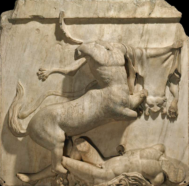 Anatomical accuracy is rigorously maintained: the depiction of straining muscles, bending joints, and swiveling torsos exemplifies a profound attention to detail. This representation of bodies that adheres to the principles of versimilitude—the weight, the resistance of muscle, and the vulnerability of the Lapith—effectively persuades the viewer of its realism. Although the subject remains mythological, hence the Laptih transcending ordinary humanity, his physique emanates an aura of nobility and perfection, thereby encapsulating the essence of the ideal Grecian concept of beauty.