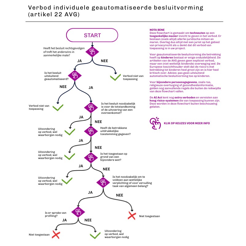 NOTA BENE Deze flowchart is gemaakt om techneuten op een toegankelijke manier inzicht te geven in het verbod. Er bestaan (zoals altijd) allerlei juridische mitsen en maren. Overleg dus altijd met een jurist op het gebied van privacyrecht als u denkt dat dit verbod van toepassing is in uw project. Voor geautomatiseerde besluitvorming die betrekking heeft op kinderen bestaat er enige onduidelijkheid. De artikelen van de AVG geven geen expliciet verbod, maar een (niet wettelijk bindende) overweging wel. De Europese toezichthouder stelt dat de risico's met betrekking tot kinderen heel groot zijn en is hier heel kritisch over. Advies: pas geen uitsluitend automatische besluitvorming toe op kinderen. Voor bijzondere persoonsgegevens, zoals ras, religieuze overtuiging of gezondheidsinformatie, gelden nog aanvullende regels die buiten de reikwijdte van deze flowchart vallen. De AI Act kent nog extra verboden en vereisten aan hoog risico-systemen die van toepassing kunnen zijn. Deze worden in deze flowchart buiten beschouwing gelaten.