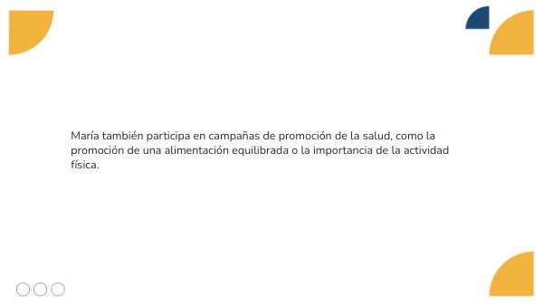 En el centro, María apoya las actividades de los programas de vigilancia de la salud, como controles periódicos de glucemia para la prevención de la diabetes. También colabora en los programas de vigilancia de enfermedades transmisibles, donde ayuda a informar a los pacientes sobre medidas de higiene y vacunación, y en la vigilancia de enfermedades no transmisibles, con charlas sobre la prevención de la hipertensión. De manera especial, participa en la vigilancia de la diabetes y sus determinantes, colaborando en talleres de autocuidado dirigidos a pacientes diagnosticados.