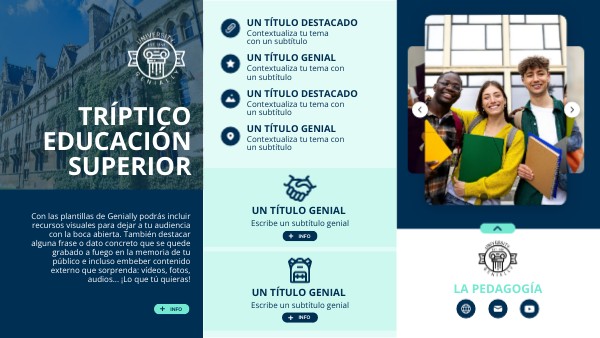 Con las plantillas de Genially podrás incluir recursos visuales para dejar a tu audiencia con la boca abierta. También destacar alguna frase o dato concreto que se quede grabado a fuego en la memoria de tu público e incluso embeber contenido externo que sorprenda: vídeos, fotos, audios... ¡Lo que tú quieras!