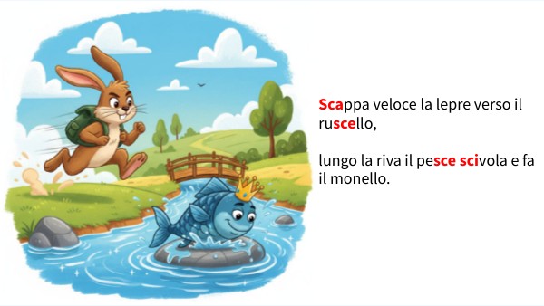 Scappa veloce la lepre verso il ruscello, lungo la riva il pesce scivola e fa il monello.