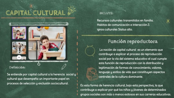 La noción de capital cultural es un elemento que contribuye a explicar el proceso de reproducción social por la vía del sistema educativo el cual cumple esta función de reproducción con la distribución y legitimación de formas de conocimiento, valores, lenguaje y estilos de vida que constituyen aspectos centrales de la cultura dominante.