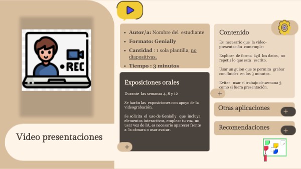 Durante las semanas 4, 8 y 12 Se harán las exposiciones con apoyo de la videograbación. Se solicita el uso de Genially que incluya elementos interactivos, emplear tu voz, no usar voz de IA, es necesario aparecer frente a la cámara o usar avatar.
