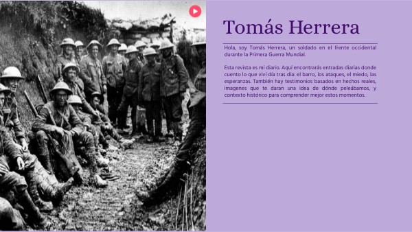 Hola, soy Tomás Herrera, un soldado en el frente occidental durante la Primera Guerra Mundial. Esta revista es mi diario. Aquí encontrarás entradas diarias donde cuento lo que viví día tras día: el barro, los ataques, el miedo, las esperanzas. También hay testimonios basados en hechos reales, imagenes que te daran una idea de dónde peleábamos, y contexto histórico para comprender mejor estos momentos.