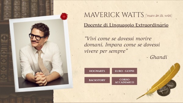 Nome: Maverick Watts Data di nascita: 13 novembre 1975 Status familiare: Mago Altezza: 179 cm Piercing: / Tatuaggi: simbolo Ankh egizia sul braccio destro Occhiali: da lettura Lentiggini: / Orientamento sessuale: demisessuale Status: single