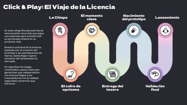 En esta infografía descubrirás el emocionante recorrido que sigue una empresa para transformar un personaje infantil en un producto real. Desde la solicitud de la licencia, pasando por la creación del prototipo y las aprobaciones de marca, hasta llegar al gran momento del lanzamiento al mercado. Un viaje lleno de magia, creatividad y pasos clave que garantizan que cadaproducto con licencia llegue a los consumidores con la calidad, seguridad y diversión que merecen..