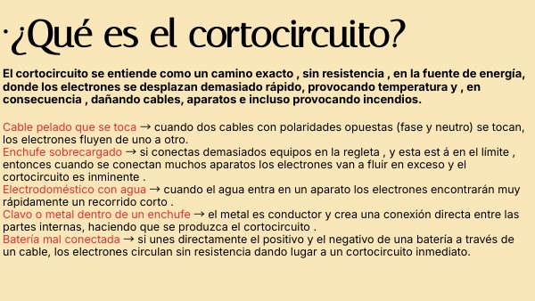 El cortocircuito se entiende como un camino exacto , sin resistencia , en la fuente de energía, donde los electrones se desplazan demasiado rápido, provocando temperatura y , en consecuencia , dañando cables, aparatos e incluso provocando incendios.