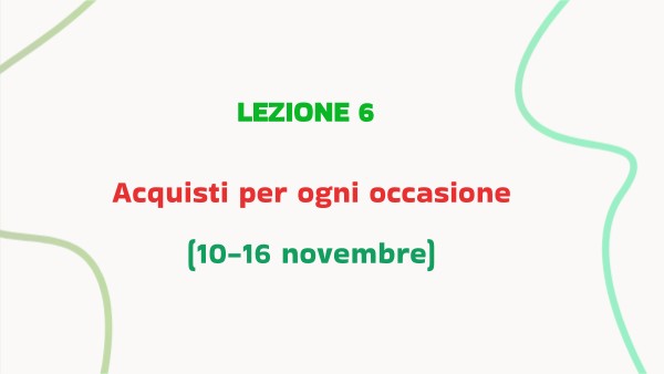 In questa lezione impareremo a parlare di festività, scrivere una lista della spesa, fare acquisti di generi alimentari, descrivere e comprare vestiti.