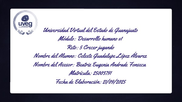 Universidad Virtual del Estado de Guanajuato Módulo: Desarrollo humano v1 Reto: 5 Crecer jugando Nombre del Alumno: Celeste Guadalupe López Álvarez Nombre del Asesor: Beatriz Eugenia Andrade Fonseca Matrícula: 25003791 Fecha de Elaboración: 21/09/2025