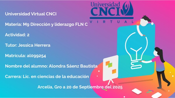 Universidad Virtual CNCI Materia: M9 Dirección y liderazgo FLN C Actividad: 2 Tutor: Jessica Herrera Matrícula: al099254 Nombre del alumno: Alondra Sáenz Bautista Carrera: Lic. en ciencias de la educación Arcelia, Gro a 20 de Septiembre del 2025