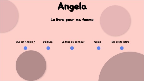 Eh bien Angela, tu es vraiment une femme incroyable. Je suis tellement heureux d'avoir fait ta rencontre il y a maintenant presque deux ans, une rencontre qui a changé ma vie à tout jamais. Vraiment, grâce à toi, j'ai grandi, j'ai appris ce que c'était l'amour. Grâce à toi, une femme incroyable, très forte, sans qui Je ne serais rien, vraiment une personne incroyable, juste la future femme de mes enfants avec qui je finirais ma vie car tu es tellement forte, belle, intelligente et belle. Tu dois vraiment garder confiance en toi car tu es une superbe fille, tu es parfaite dans tout ce que tu fais, vraiment ne change pas.J'espère que tu as aimé ce petit livre sur toi. Il va évoluer dans le temps, n'inquiète pas et je t'aime, Angela. C'était Noé, ton amoureux.