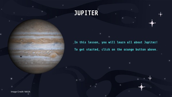 In this lesson, you will learn all about Jupiter! To get started, click on the orange button above.