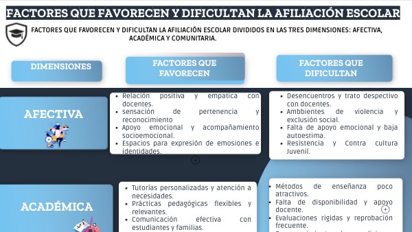 FACTORES QUE FAVORECEN Y DIFICULTAN LA AFILIACIÓN ESCOLAR DIVIDIDOS EN LAS TRES DIMENSIONES: AFECTIVA, ACADÉMICA Y COMUNITARIA.