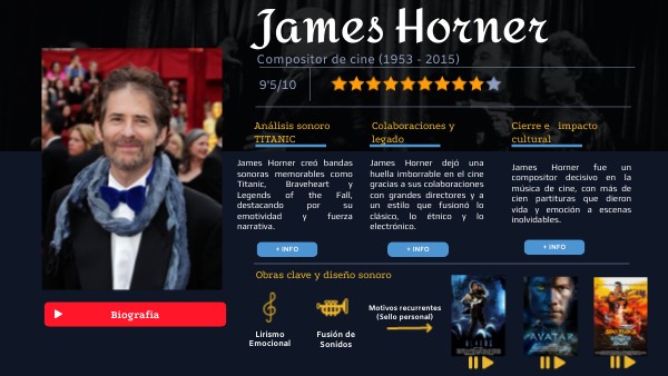James Horner creó bandas sonoras memorables como Titanic, Braveheart y Legends of the Fall, destacando por su emotividad y fuerza narrativa.