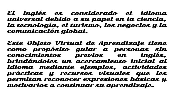El inglés es considerado el idioma universal debido a su papel en la ciencia, la tecnología, el turismo, los negocios y la comunicación global. Este Objeto Virtual de Aprendizaje tiene como propósito guiar a personas sin conocimientos previos en inglés, brindándoles un acercamiento inicial al idioma mediante ejemplos, actividades prácticas y recursos visuales que les permitan reconocer expresiones básicas y motivarlos a continuar su aprendizaje.