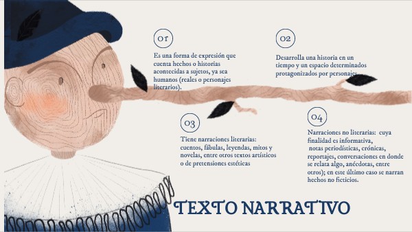 Tiene narraciones literarias: cuentos, fábulas, leyendas, mitos y novelas, entre otros textos artísticos o de pretensiones estéticas