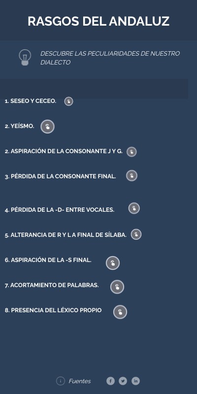 1. SESEO Y CECEO. 2. YEÍSMO. 2. ASPIRACIÓN DE LA CONSONANTE J Y G. 3. PÉRDIDA DE LA CONSONANTE FINAL. 4. PÉRDIDA DE LA -D- ENTRE VOCALES. 5. ALTERANCIA DE R Y L A FINAL DE SÍLABA. 6. ASPIRACIÓN DE LA -S FINAL. 7. ACORTAMIENTO DE PALABRAS. 8. PRESENCIA DEL LÉXICO PROPIO