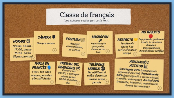 Continguts 20% (comprensió i expressió escrita), Procediments 50% (participació a classe virtual, treballs i entregues), Actitud 30% (respecte, iniciativa, organització durant les sessions)