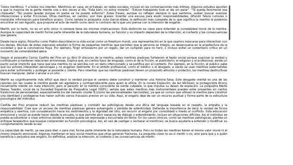 1. Presencia de la mentira en la mayoría de las personas 1.1. Mentiras socialmente bien vistas (piadosas) 1.2. Mentiras socialmente mal vistas (graves) 1.3. Según Julia García-Albea la definición más exacta es la de San Agustín: lo opuesto a lo que se piensa para engañar al otro. 1.4. Distinción de mentiras según la propósito, situación y repercusión.2. Aportaciones/reflexiones acerca de la mentira según distintos autores: 2.1. Platón (filósofo griego): la vida social es un theatrum mundi donde las personas usan máscaras para que las relaciones sociales funcionen. 2.2. Carlos Castilla del Pino, El discurso de la mentira (psiquiatra): las mentiras piadosas ayudan a mantener relaciones interpersonales agradables y las destructivas buscan el daño. 2.3. La mentira es un ejercicio de desgaste mental: Ian McEwan narra la experiencia vivida por la protagonista que usa la mentira y busca la reparación. 2.4. Marta Navas Tejedor (psiquiatra): existe la mentira como patología (trastorno de la personalidad, por ejemplo, el narcisismo). 3. Propuesta/solución de Carlos Castilla del Pino 3.1. Mentiras piadosas: reducirlas y decir la verdad desde una postura asertiva ya que pueden provocar desconfianza. 3.1.1. Método: desde el colegio para normalizar decir la verdad. 3.2. Mentiras patológicas: tratarlas con terapia y dar apoyo al paciente. 4. Dada la inherencia de la mentira al ser humano, es clave analizar la utilidad de la misma según su propósito, situación y repercusión.