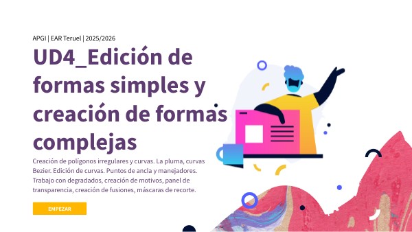 Creación de polígonos irregulares y curvas. La pluma, curvas Bezier. Edición de curvas. Puntos de ancla y manejadores. Trabajo con degradados, creación de motivos, panel de transparencia, creación de fusiones, máscaras de recorte.