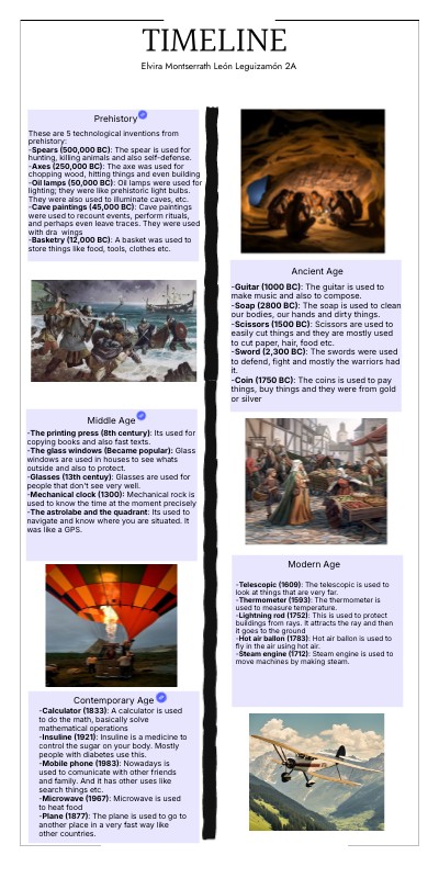 These are 5 technological inventions from prehistory:-Spears (500,000 BC): The spear is used for hunting, killing animals and also self-defense. -Axes (250,000 BC): The axe was used for chopping wood, hitting things and even building -Oil lamps (50,000 BC): Oil lamps were used for lighting; they were like prehistoric light bulbs. They were also used to illuminate caves, etc. -Cave paintings (45,000 BC): Cave paintings were used to recount events, perform rituals, and perhaps even leave traces. They were used with dra wings -Basketry (12,000 BC): A basket was used to store things like food, tools, clothes etc.