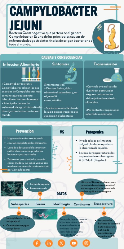 Bacteria Gram negativa que pertenece al género Campylobacter. Es una de las principales causas de enfermedades gastrointestinales de origen bacteriano en todo el mundo.