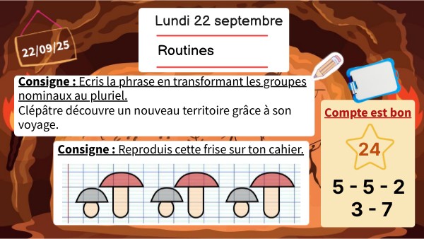 Consigne : Ecris la phrase en transformant les groupes nominaux au pluriel. Clépâtre découvre un nouveau territoire grâce à son voyage.