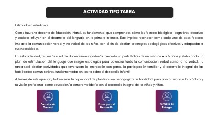 Estimado/a estudiante: Como futuro/a docente de Educación Infantil, es fundamental que comprendas cómo los factores biológicos, cognitivos, afectivos y sociales influyen en el desarrollo del lenguaje en la primera infancia. Esto implica reconocer cómo cada uno de estos factores impacta la comunicación verbal y no verbal de los niños, con el fin de diseñar estrategias pedagógicas efectivas y adaptadas a sus necesidades. En esta actividad, asumirás el rol de docente-investigador/a, creando un perfil ficticio de un niño de 4 a 6 años y elaborando un plan de estimulación del lenguaje que integre estrategias para potenciar tanto la comunicación verbal como la no verbal. Tu tarea será diseñar actividades que favorezcan la interacción con pares, la participación familiar y el desarrollo integral de las habilidades comunicativas, fundamentadas en teoría sobre el desarrollo infantil. A través de este ejercicio, fortalecerás tu capacidad de planificación pedagógica, tu habilidad para aplicar teoría a la práctica y tu visión profesional como educador/a comprometido/a con el desarrollo integral de los niños y niñas.