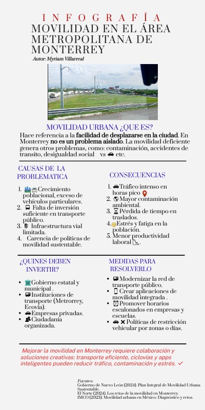 Hace referencia a la facilidad de desplazarse en la ciudad. En Monterrey no es un problema aislado. La movilidad deficiente genera otros problemas, como: contaminación, accidentes de transito, desigualdad social 🚶♀️ vs 🚗 etc.