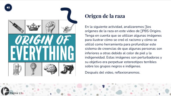 En la siguiente actividad, analizaremos los orígenes de la raza en este video de PBS Origins. Tenga en cuenta que se utilizan algunas imágenes para ilustrar cómo se creó el racismo y cómo se utilizó como herramienta para profundizar este sistema de creencias de que algunas personas son inferiores a otras debido al color de piel y la indigeneidad. Estas imágenes son perturbadoras y su objetivo era perpetuar estereotipos terribles sobre los grupos negros e indígenas. Después del video, reflexionaremos.
