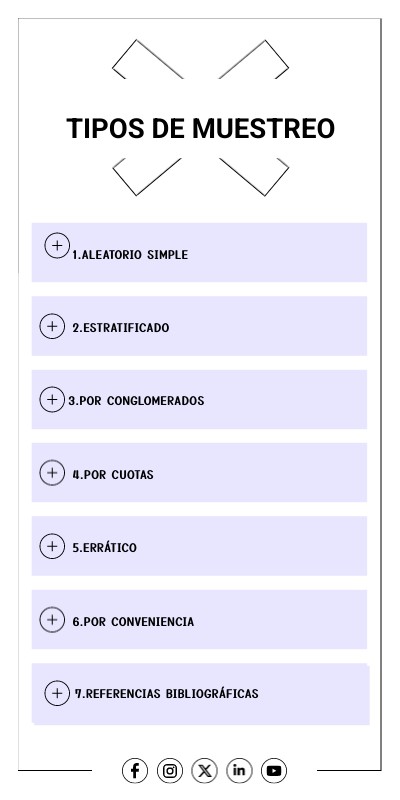 ● Concepto/características similar estratificado no aleatorio; se establece cuota (cantidad) ● Proceso (pasos) {población} -> [cuota + atributos] -> {grupos} ● Fortalezas + representativo que por conveniencia + práctico que los probabilísticos ● Limitaciones: sesgo de selección● Tipo: no probabilístico● Concepto/características accesibilidad, juicio u otros criterios ● Proceso (pasos) selección participantes disponibles ● Fortalezas: rápido, barato y sencillo ● Limitaciones: alto riesgo sesgo, muestra no representativa