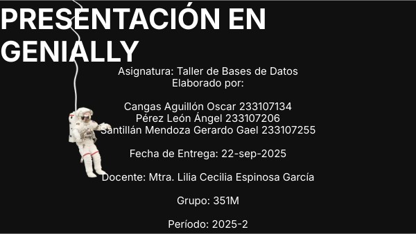 Asignatura: Taller de Bases de Datos Elaborado por: Cangas Aguillón Oscar 233107134 Pérez León Ángel 233107206 Santillán Mendoza Gerardo Gael 233107255 Fecha de Entrega: 22-sep-2025 Docente: Mtra. Lilia Cecilia Espinosa García Grupo: 351M Período: 2025-2