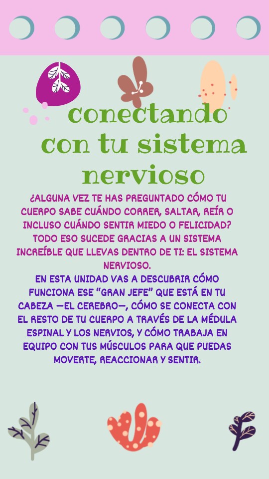 ¿Alguna vez te has preguntado cómo tu cuerpo sabe cuándo correr, saltar, reír o incluso cuándo sentir miedo o felicidad? Todo eso sucede gracias a un sistema increíble que llevas dentro de ti: el Sistema Nervioso. En esta unidad vas a descubrir cómo funciona ese “gran jefe” que está en tu cabeza —el cerebro—, cómo se conecta con el resto de tu cuerpo a través de la médula espinal y los nervios, y cómo trabaja en equipo con tus músculos para que puedas moverte, reaccionar y sentir.
